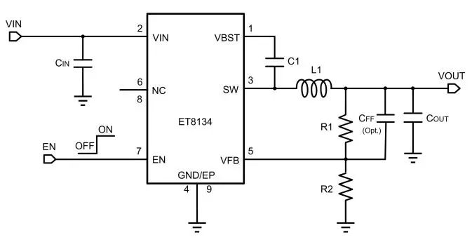 ET8134采用ESOP8封裝,該封裝具有良好的散熱性能。