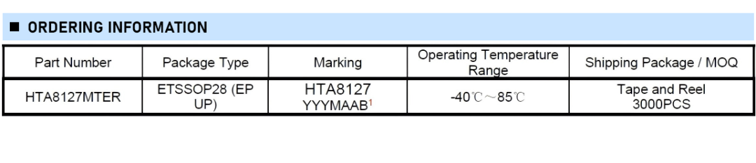 HTA8128 雙鋰電池7.4V:2×40W (VOUT=18V, THD+N= 10%) ; 三鋰電池12V:2×60W (VOUT=22V, THD+N = 10%) TSSOP-32 2.7V至VOUT 內(nèi)置升壓的60W立體聲D類音頻功放芯片