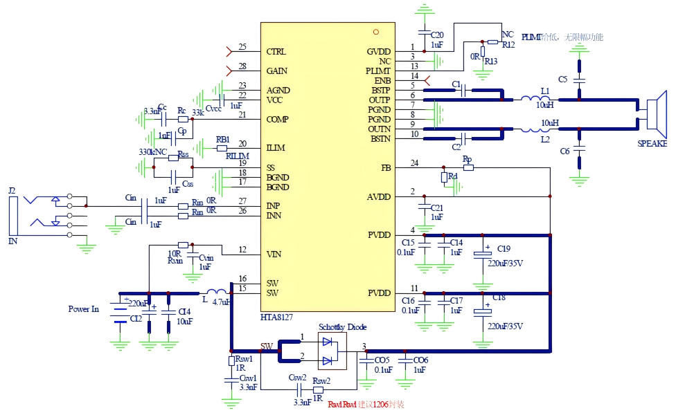 HTA8127內(nèi)部集成免濾波器調(diào)制技術(shù),能夠直接驅(qū)動揚(yáng)聲器,內(nèi)置的關(guān)斷功能使待機(jī)電流最小化,還集成了升壓電壓過壓保護(hù)、輸入電源欠壓異常保護(hù)、輸出端過流保護(hù)、片內(nèi)過溫保護(hù)等功能。