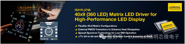 近日絡明芯發(fā)布高亮度、高靈活性、高可靠性LED驅動芯片IS31FL3758。該芯片支持最大40×9矩陣,單芯片驅動多達360個單色LED燈珠或117個RGB LED燈珠。芯片支持每個LED 256級 PWM調光和3組256級全局電流調節(jié),能夠實現(xiàn)細膩亮度控制。目標應用市場包含白色家電顯示面板、LCD屏區(qū)域背光和游戲機,鍵盤等。