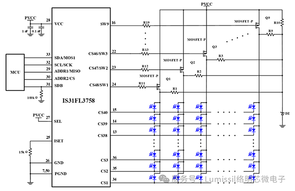 IS31FL3758內(nèi)置48路恒流源,每個通道的最大輸出電流可達60mA。芯片不僅支持48通道的獨立驅動,還能通過控制2~9個外部功率PMOS,靈活配置為46×2、45×3……40×8、40×9的LED矩陣。這種靈活架構使其既能滿足單通大電流、高亮度的應用需求,又能適應各種不同尺寸和分辨率的大型矩陣顯示場景。芯片內(nèi)部集成掃描時序控制電路,大大簡化MCU的控制復雜度。掃描管外置設計,將掃描管的功耗轉移到外部PMOS管,對于大電流,高功率的應用能夠大大降低芯片的溫升。