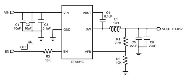 ET81313采用了SOT563形式的小封裝,配合高度集成的內(nèi)部電路以及簡單的外部器件,能夠以更小的應用面積去布局。