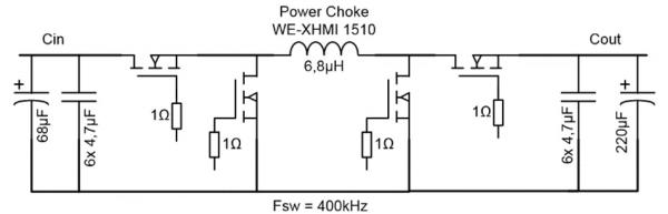 對于具有較高輸入和輸出功率的 DC/DC 轉(zhuǎn)換器,必須在輸入和輸出端都使用濾波器以減少干擾發(fā)射。然而,在輸入和輸出電流較大的情況下,很難在效率、尺寸、濾波器的衰減和成本以及實際功率級這些參數(shù)之間取得平衡。圖1是一個 100 瓦降壓升壓 DC/DC 設(shè)計的示例,它展示了在布局和元器件選擇方面應(yīng)考慮哪些因素。