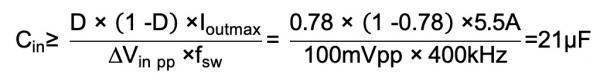 由于通過隔直電容器的脈沖電流高且要求的紋波低,鋁聚合物電容器和陶瓷電容器的組合是最佳選擇。通過確定允許的最大輸入和輸出電壓紋波,所需的電容可以按照以下公式進行計算: