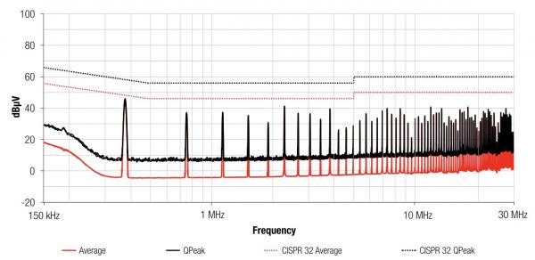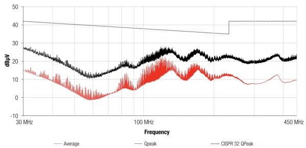 圖10:在輸入端帶濾波器的測量傳導(dǎo)發(fā)射。平均值和準峰值在整個測量范圍內(nèi)均低于限值。
