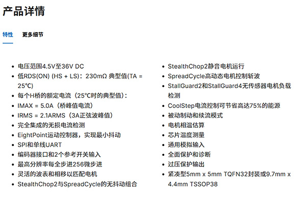 ADI TMC5240 是一款智能高性能步進(jìn)電機(jī)控制器和驅(qū)動(dòng)器 IC,具有串行通信接口 (SPI、UART) 和廣泛的診斷功能。它結(jié)合了靈活的、經(jīng)過(guò)抖動(dòng)優(yōu)化的斜坡生成器,用于自動(dòng)目標(biāo)定位,并配備了業(yè)界最先進(jìn)的步進(jìn)電機(jī)驅(qū)動(dòng)器,基于內(nèi)置的 256 微步進(jìn)分度器,以及兩個(gè)完全集成的 36V、3.0A (最大) H 橋和無(wú)耗散的集成電流檢測(cè) (ICS)。下圖 (圖1) 為它的產(chǎn)品特性: