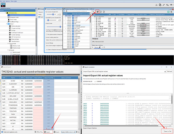 - • TMCL-IDE + TMC5240-EVAL 評(píng)估板 (圖形化界面快速地配置電機(jī)基礎(chǔ)參數(shù))