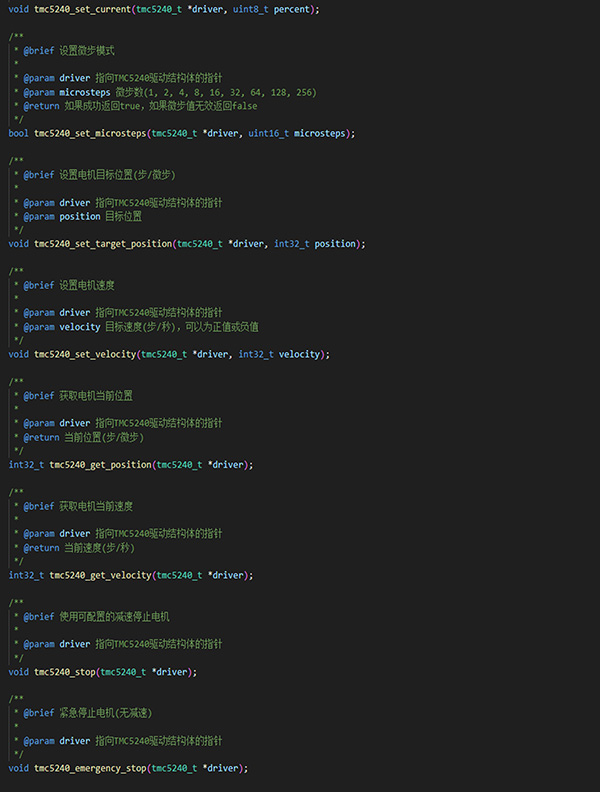 為了簡(jiǎn)化寄存器寫(xiě)入的過(guò)程,作者整理了一份庫(kù)函數(shù)代碼。如下圖 (圖9) 展示了部分代碼,這套代碼已通過(guò)實(shí)例封裝了電機(jī)的相關(guān)配置,并提供了多個(gè)常用函數(shù),這些函數(shù)能方便開(kāi)發(fā)者快速上手進(jìn)行調(diào)試。