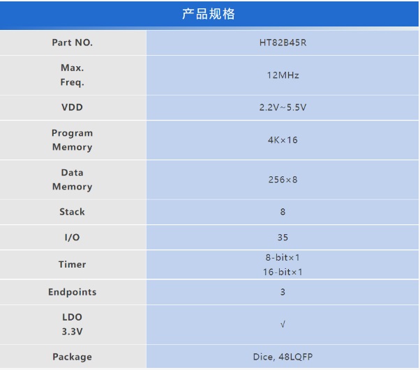 HT82B45R工作電壓2.2V~5.5V,系統(tǒng)頻率為內(nèi)建12MHz振蕩器,有效簡化外圍元件。產(chǎn)品規(guī)格包含有4K × 16 OTP ROM、256 Bytes RAM、低速USB、3個Endpoints、最多35個雙向I/O、1組8-bit Timer、1組16-bit Timer以及內(nèi)建3.3V LDO提供USB所需電壓,USB模式下內(nèi)部12MHz 振蕩器的精準(zhǔn)度可達(dá)到±1.5%。提供Dice與48-Pin LQFP封裝形式選擇。