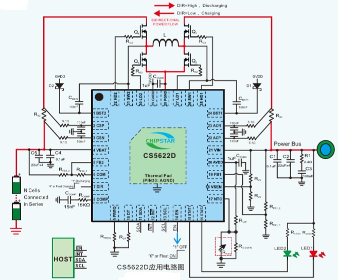 CS5622D支持雙向輸出。通過DIR管腳即可控制工作方向。它同時支持包括輸入限流、輸出限流、輸出過壓保護、短路保護以及過溫保護等一系列保護功能,以確保系統(tǒng)能適應(yīng)各種異常情況。