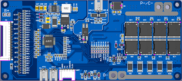 SoC計(jì)算,充放電功率通路和可選的BT/WiFi通信和RS-485通信。該BMS方案將電池組單體電壓、電流、溫度進(jìn)行實(shí)時(shí)監(jiān)控并上報(bào)用戶,并根據(jù)用戶設(shè)定的保護(hù)參數(shù)進(jìn)行自我控制,在電池組工作異常的情況下及時(shí)關(guān)斷充放電。該方案通用性比較強(qiáng),可以根據(jù)用戶需求,在10~17串范圍內(nèi)電池串?dāng)?shù),采用低邊驅(qū)動(dòng)同口設(shè)計(jì)方案,充放電電流高達(dá)60-80A,兼容NCM、LFP等鋰電池。