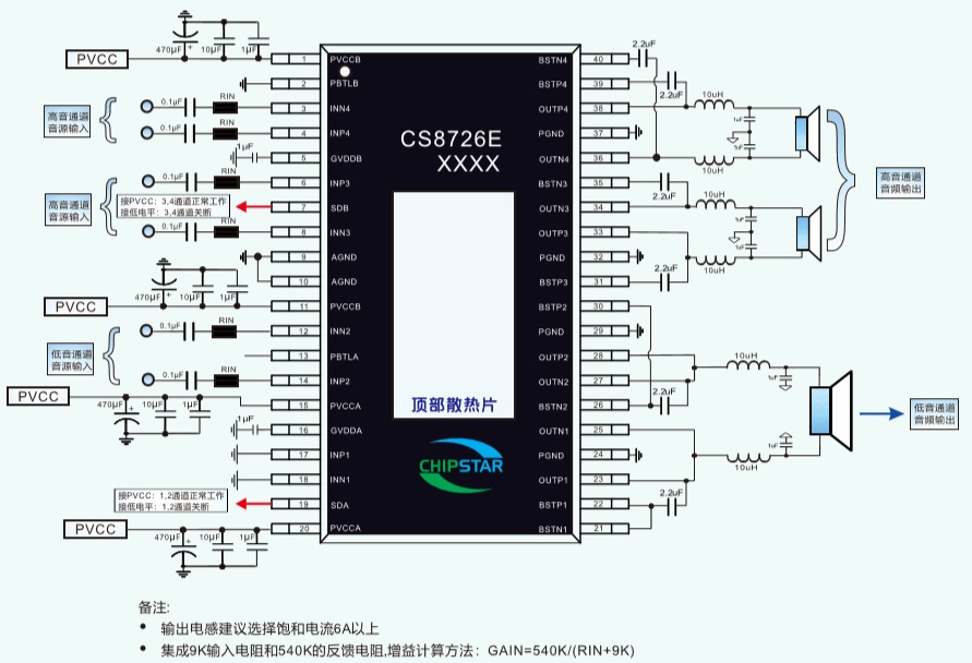 CS8726E內(nèi)置了過流保護(hù),短路保護(hù)和過熱保護(hù),有效的保護(hù)芯片在異常的工作條件下不被損壞。