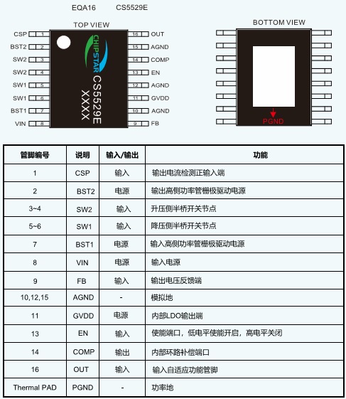 CS5529 輸入電壓:2.8V-18V;輸出可調電壓:1V-18V;最大輸出電流3A EQA-16 2.8V-18V 帶恒流功能、功率管全集成、24V耐壓、3A電流,單電感升降壓DC-DC芯片