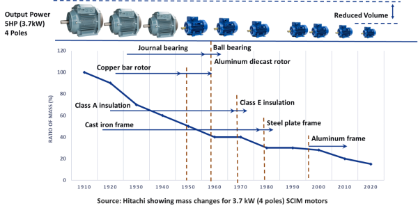 從滑動軸承到滾動軸承的轉(zhuǎn)型,對降低摩擦、提高精度從而提升電機效率起到了關(guān)鍵作用。過去一個世紀(jì)以來,電機在保持相同功率輸出的前提下實現(xiàn)了顯著小型化。以現(xiàn)代5馬力鼠籠式轉(zhuǎn)子三相感應(yīng)電機(SCIM)為例,其體積大幅縮小,重量僅為1910年同功率電機的20%左右。這種尺寸縮減得益于更輕量化高效材料的應(yīng)用,以及熱絕緣和電絕緣技術(shù)的進步。更輕巧的電機對汽車應(yīng)用尤為有利——既可通過減重提升能效,又能將電機集成到更緊湊的空間。這些技術(shù)進步的影響深遠,造就了能效更高、性能更優(yōu)且更節(jié)能的電機系統(tǒng)。