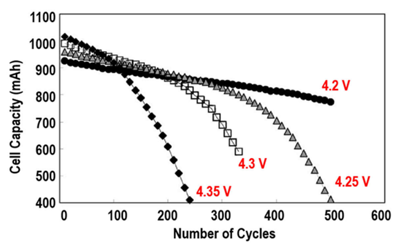 圖 3. 鋰離子電池容量與充電循環(huán)數(shù)量之間的關(guān)系。