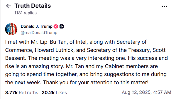 然而,在當(dāng)?shù)貢r(shí)間8月11日,英特爾CEO陳立武赴白宮與特朗普進(jìn)行了會談之后,特朗普的態(tài)度便出現(xiàn)了180度大轉(zhuǎn)彎。