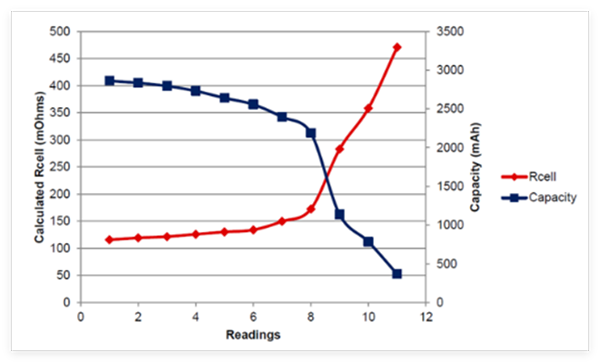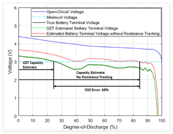 跟蹤電阻對于在電池的整個使用壽命期間提供最高精度的荷電狀態(tài)計算至關(guān)重要。如圖 2 所示,電池單元的電阻會隨著電池的循環(huán)和老化而線性增加,直到達(dá)到某個轉(zhuǎn)折點,在此轉(zhuǎn)折點處,電阻會呈指數(shù)級增長,直至電池壽命結(jié)束。電阻也會隨溫度而發(fā)生顯著波動。電池單元的電阻與溫度呈反比關(guān)系,溫度越低,電阻越高;因此,電池單元在達(dá)到 0% 荷電狀態(tài)之前所能提供的容量或能量就越低。