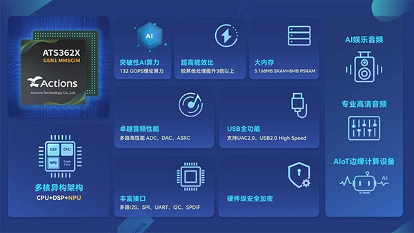 炬芯®端側(cè)AI音頻芯片ATS362X已在品牌客戶音頻產(chǎn)品中立項(xiàng)落地,深度融合低功耗設(shè)計的深厚積淀與端側(cè) AI 的創(chuàng)新技術(shù),憑借6.4 TOPS/W 的超高能效比,可支持聲紋識別、環(huán)境音分類等復(fù)雜模型在端側(cè)實(shí)現(xiàn)實(shí)時推理。這一特性讓音頻設(shè)備在搭載強(qiáng)大 AI功能的同時,仍能維持超長續(xù)航,輕松滿足全天候使用需求,為各類電池驅(qū)動設(shè)備提供穩(wěn)定可靠的性能支撐。