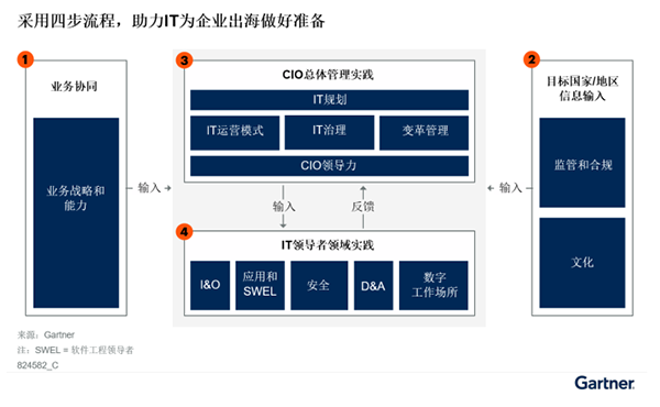 受到新市場準入等業(yè)務機會和“一帶一路”等政府倡議的推動,出海成為中國企業(yè)的重要趨勢。目前,中國首席信息官(CIO)在為企業(yè)出海進行IT準備時,往往將IT視為和國內業(yè)務站點設定類似的被動支持角色,主要關注技術和服務的就緒情況,如為目標地區(qū)選擇云提供商和部署企業(yè)資源規(guī)劃(ERP)(實例),而非主動尋求業(yè)務賦能。然而,首席執(zhí)行官(CEO)和業(yè)務領導者希望IT在本輪出海浪潮中發(fā)揮戰(zhàn)略合作伙伴的作用,不僅促進業(yè)務在當?shù)氐目焖賳,而且能夠通過數(shù)字技術塑造企業(yè)的未來,如在總部和出海地點之間建立和維護企業(yè)級的業(yè)務協(xié)同。這對許多中國CIO而言是一項挑戰(zhàn),因為這是他們首次面臨此類情況。為了幫助CIO及IT領導者成功實現(xiàn)這一目標,Gartner制定了一個包含四步流程的綜合框架(見下圖1),為CIO領導下的IT成功賦能企業(yè)出海提供指導。