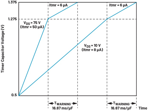 這種保護(hù)機(jī)制的工作原理是,根據(jù)所測(cè)量的電流和壓降,對(duì)圖1中TMR引腳上的定時(shí)電容器進(jìn)行充電。如果電容器上的電壓上升到1.275 V以上,就會(huì)發(fā)出警告。而當(dāng)電壓高于1.375 V時(shí),MOSFET會(huì)完全關(guān)斷,以實(shí)施保護(hù)。