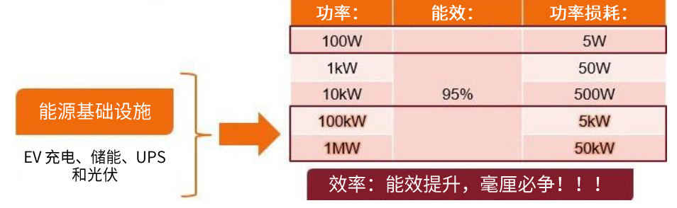 對于傳統(tǒng)的小功率產(chǎn)品 (~100 W), 95% 的效率是可以接受的。對于使用數(shù)百千瓦或兆瓦的高功率應(yīng)用而言 , 管理功耗是一項(xiàng)更為復(fù)雜的設(shè)計(jì)工作, 因?yàn)樾实拿壳Х种欢己苤匾?/font>