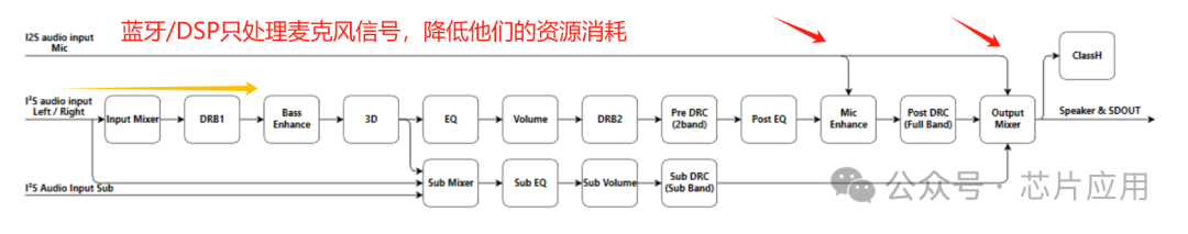 主控/DSP只處理麥克風(fēng)信號(hào),不再處理背景音樂,這樣降低了主控資源的消耗。將背景音樂的調(diào)音交給數(shù)字功放。調(diào)試好的兩路信號(hào)在最后端混合,兩路信號(hào)之間的調(diào)試互不影響。