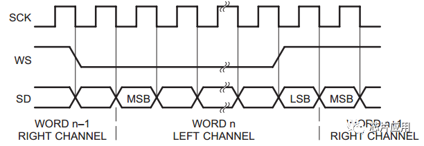 WS也稱幀時(shí)鐘,即LRCLK/Left RightClockWS頻率等于聲音的采樣率。WS既可以在SCK的上升沿,也可以在SCK的下降沿變化。從設(shè)備在SCK的上升沿采樣WS信號(hào)。數(shù)據(jù)信號(hào)MSBWS改變后的第二個(gè)時(shí)鐘(SCK)上升沿有效(即延遲一個(gè)SCK),這樣可以讓從設(shè)備有足夠的時(shí)間以存儲(chǔ)當(dāng)前接收的數(shù)據(jù),并準(zhǔn)備好接收下一組數(shù)據(jù)。