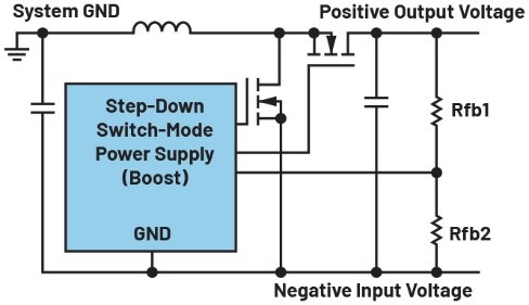 然而,有時電壓需要反相。在大多數(shù)情況下,需要將正電源電壓轉(zhuǎn)換為負電壓。這是為了給信號路徑中的傳感器供電,使其能夠處理具有正負電壓偏轉(zhuǎn)的信號。例如,+5V和-5V用作運算放大器的電源,以處理信號電壓。某些應(yīng)用需要負電壓來安全關(guān)斷MOSFET的柵極。要從現(xiàn)有正電壓產(chǎn)生負電壓,圖1所示的反相拓撲是合適的方案。其中,正電壓被轉(zhuǎn)換為負電壓。這種電路結(jié)構(gòu)簡單,不需要變壓器,可以利用標(biāo)準(zhǔn)降壓型開關(guān)穩(wěn)壓器IC構(gòu)建。降壓型穩(wěn)壓器的輸出電壓連接至系統(tǒng)接地端,GND引腳電壓產(chǎn)生負電壓,該負電壓可通過電阻分壓器Rfb1和Rfb2進行調(diào)節(jié)。