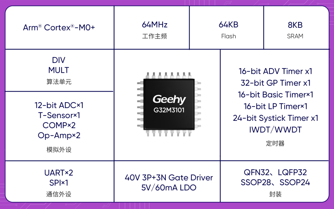 G32M3101系列搭載Arm® Cortex®-M0+內(nèi)核,主頻64MHz,F(xiàn)lash 64KB,SRAM 8KB為電機控制應(yīng)用提供高效的處理性能;內(nèi)置DIV/MULT算法單元加速,可高效實現(xiàn)有感/無感FOC算法控制。集成40V 3P+3N柵極驅(qū)動器,內(nèi)置240ns死區(qū)時間,欠壓保護、防直通保護等多種功能,有效保障系統(tǒng)穩(wěn)定運行;內(nèi)置5V/60mA  ±0.5%高精度LDO,為內(nèi)部MCU提供電源,無需額外電源模塊。
