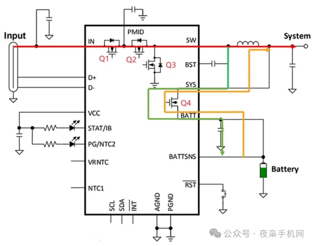 如下圖,在上面方案的基礎(chǔ)上,引入了一個MOS管(行業(yè)內(nèi)部稱為Q4管,也稱BATFET),該MOS把VSYS和VBAT隔開,并引入配套的控制策略,便實現(xiàn)了路徑管理功能。