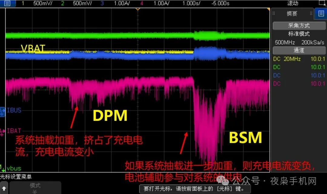 如下圖,為手機buck charge IC BSM模式的波形。IBAT為正表示進電池電流(充電),負(fù)表示出電池電流(放電),我們能夠觀察到DPM和BSM的表現(xiàn)。