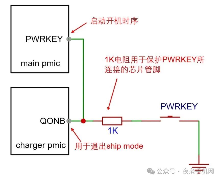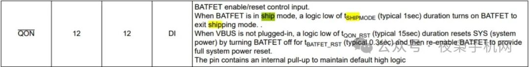 buck charger IC有個QON引腳,用于控制運輸模式的退出,在手機電路上通常連接到開機鍵。這樣用戶第一次開機的動作就讓手機退出運輸模式了。此外,除了按開機鍵,我們插入充電器,也可以自動退出Ship Mode。