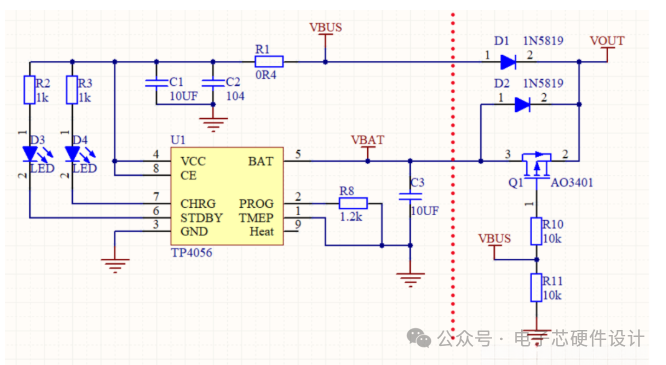2. 防反接與續(xù)流:D1、D2為肖特基二極管(1N5819),單向?qū)ǚ乐闺娏鞯构啵瑫r在VBUS/電池切換時提供續(xù)流路徑,保證VOUT輸出穩(wěn)定。