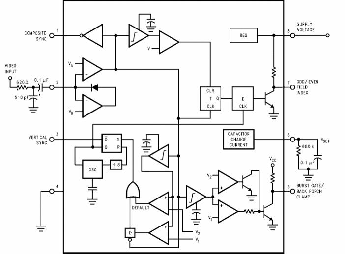 芯片也可以用于非標(biāo)準(zhǔn)或者行頻速度更快的視頻信號。標(biāo)準(zhǔn)視頻信號的場脈沖輸出開始于輸入信號的場脈沖沿,而當(dāng)輸入的是非標(biāo)準(zhǔn)視頻信號時,場脈沖輸出在特定延遲后發(fā)生。