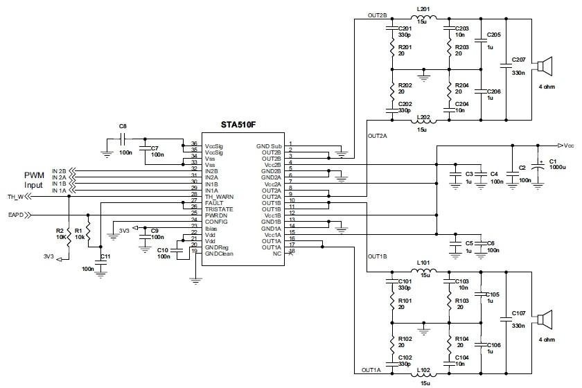 The device is particularly designed to make theoutput stage of a stereo all-digital high-efficiency(FFX) amplifier capable of delivering 100 W +100 W output power into 8-Ω loads withTHD = 10% and Vcc = 39 V. In single BTL