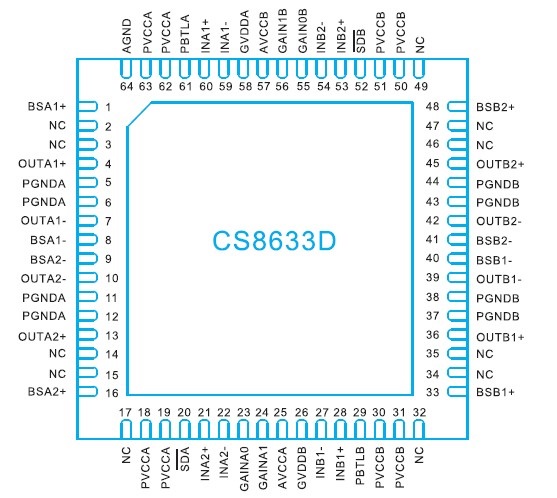CS8633D 提供纖小的QFN8X8_64L封裝形式供客戶選擇,可以為客戶節(jié)省客觀的PCB面積,其額定的工作溫度范圍為-40℃至85℃。