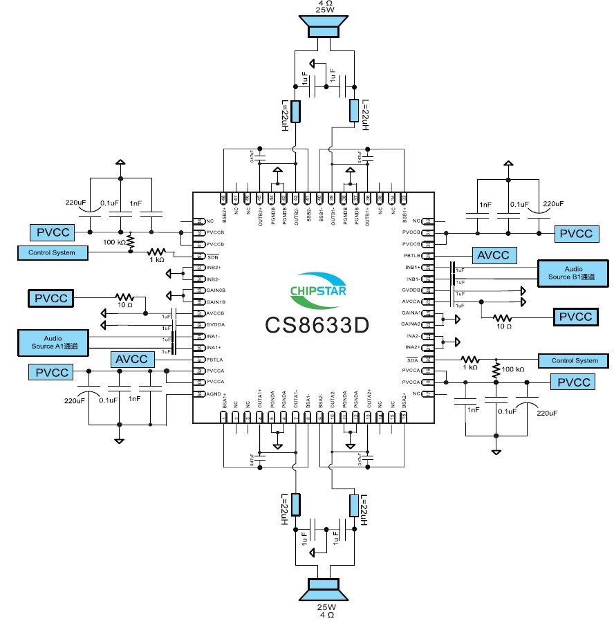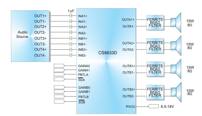 CS8633D 內(nèi)置了過流保護(hù),短路保護(hù)和過熱保護(hù),有效的保護(hù)芯片在異常的工作條件下不被破壞。CS8633D 利用芯片自帶的PBTL功能可以方便的應(yīng)用在2.0,2.1或者4.0等音響系統(tǒng)上,可以為兩路4歐負(fù)載提供2X25W的連續(xù)功率,也可以為四路8歐負(fù)載提供4X15W的連續(xù)功率,特別針對(duì)2.1的音響系統(tǒng)可以提供1路4歐負(fù)載驅(qū)動(dòng),兩路8歐的負(fù)載驅(qū)動(dòng),為整個(gè)音頻系統(tǒng)提供25W+2X15W的整體輸出功率。CS8633D 具備90%的效率,使得在播放音樂的時(shí)候不需要額外的散熱設(shè)計(jì)。