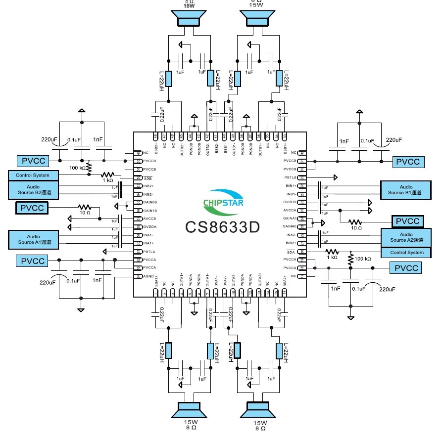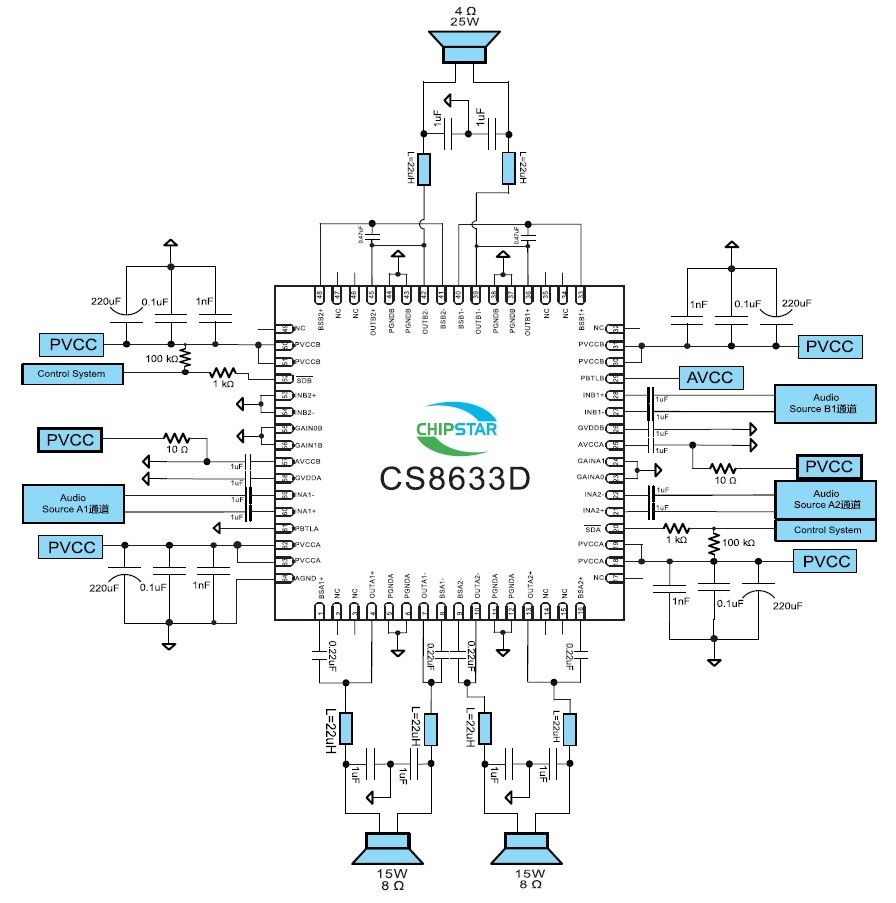產(chǎn)品名稱: CS8633 (4X15W四聲道/25W+2X15W 2.1聲道單芯片D類功放IC)