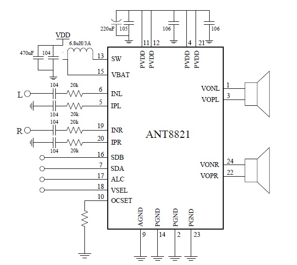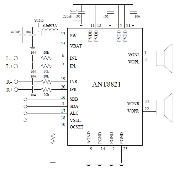 固定21倍增益,防破音,AB/D切換,電源自動增益調(diào)節(jié),功率限制,多階電源自適應(yīng)功能 內(nèi)置BOOST升壓模塊,恒定10W輸出功率R類單聲道音頻功率放大器 |