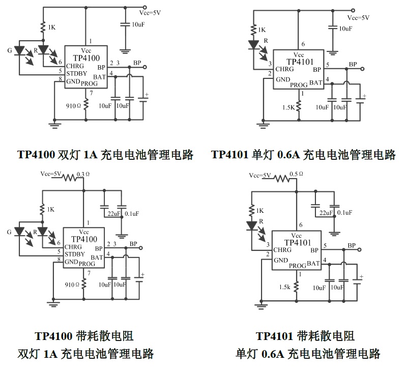 TP4100/TP4101 應(yīng)用中Vcc 端和BAT 端分別10uF 的陶瓷電容以及0.1uF 陶瓷電容,所有電