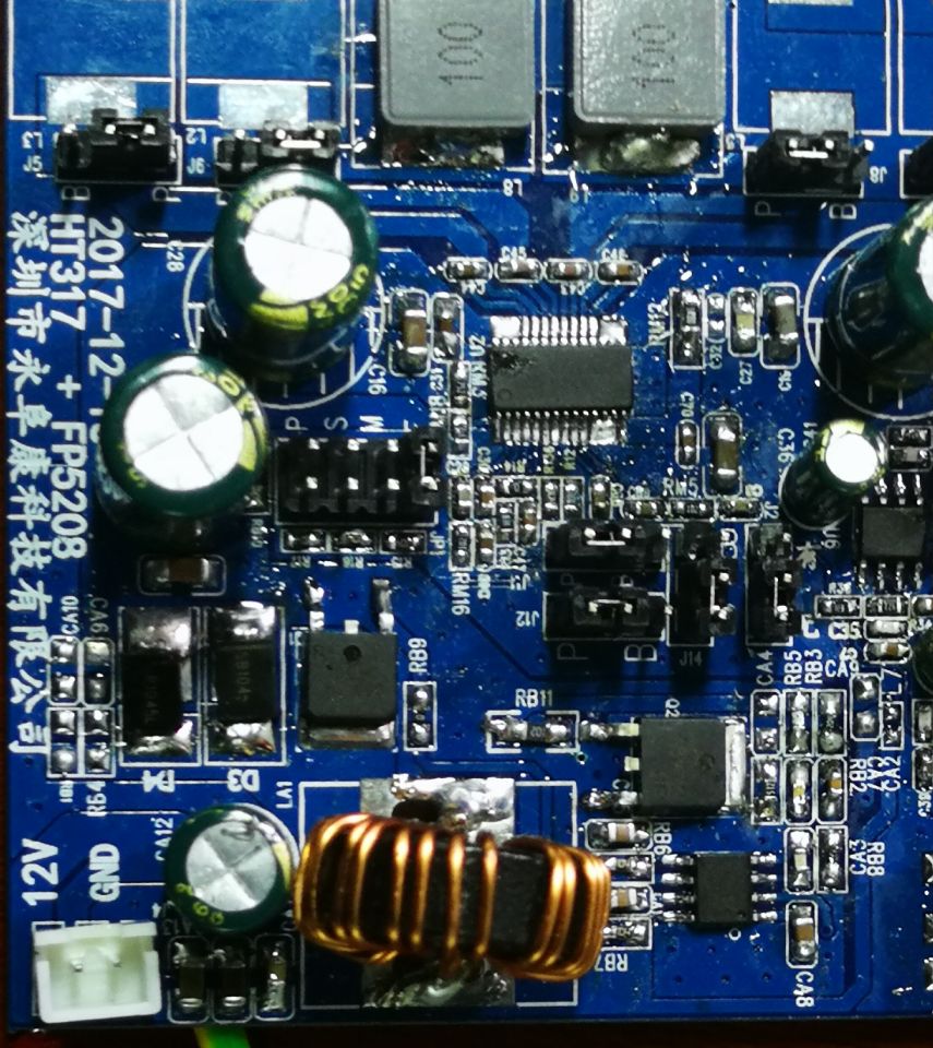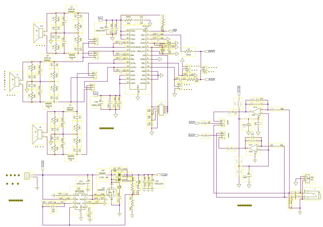 2. 采用HT317 D類音頻功放IC,24V提供75W功率輸出;
