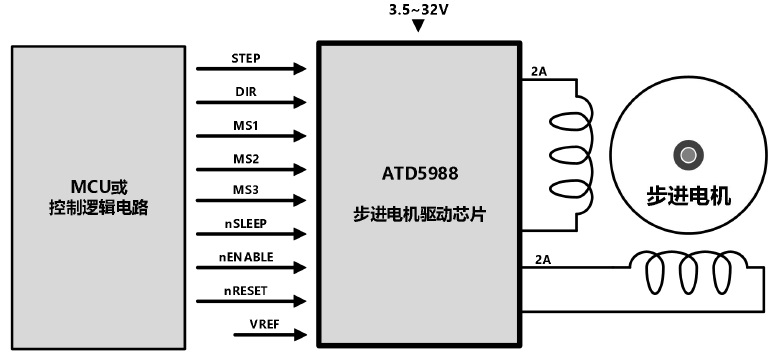 ATD5988是一種便于使用的內(nèi)部集成了譯碼器的微特步進電機驅(qū)動器。其設計為能使雙極步進電機以全、半、1/4、1/8、1/16、1/32步進模式工作。步進模式由邏輯輸入管腳MSx選擇。輸出驅(qū)動能力達到32V和±2A。