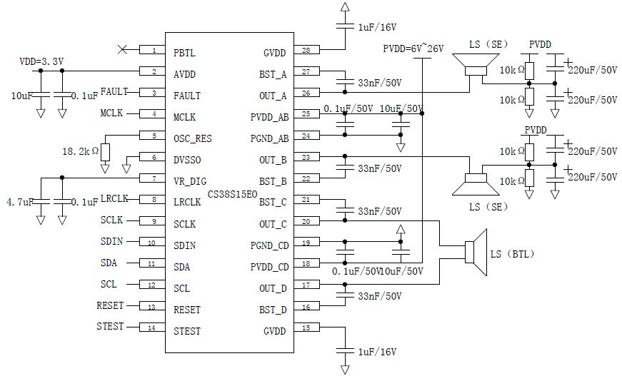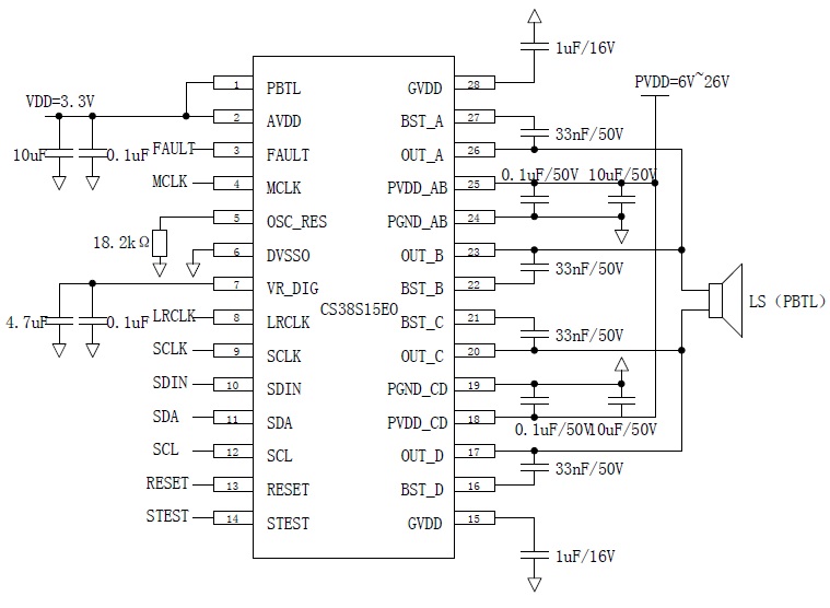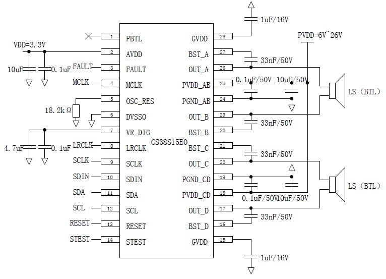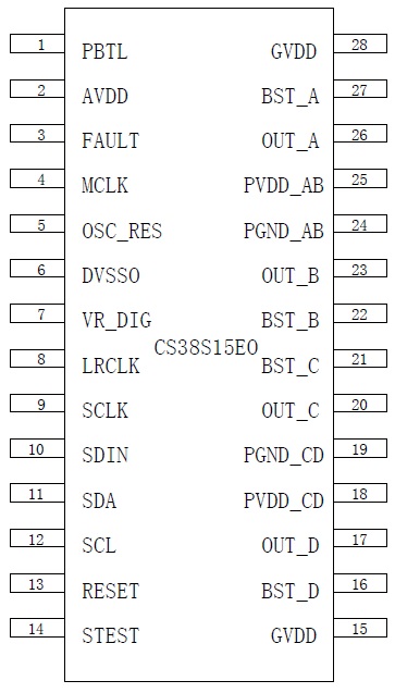 CS38S15 具備4 個獨立通道輸出(SE×4),每個通道典型輸出功率為8W,可以組成2.0 聲道模式(BTL×2,典型值15W×2),2.1 聲道模式(BTL×1+SE×2,典型值15W+8W×2),1.0 聲道模式(PBTL×1,典型值30W×1)