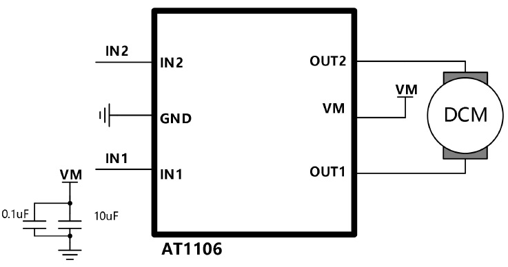 AT1106 具有一個(gè)PWM (IN1/IN2) 輸入接口;