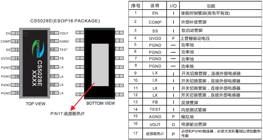 CS5028E提供了ESOP16的封裝類型,其額定的工作溫度范圍為-40℃至85℃。