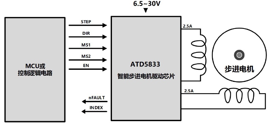 ATD5833是一款內(nèi)置有譯碼器的智能步進(jìn)電機(jī)驅(qū)動(dòng)器。其輸出驅(qū)動(dòng)能力達(dá)到30V ±2.5A,最高支持16細(xì)分,同時(shí)可實(shí)現(xiàn)插補(bǔ)細(xì)分工作。譯碼器是ATD5833易于使用的關(guān)鍵。通過(guò)STEP管腳簡(jiǎn)單地輸入一個(gè)脈沖就可以使電機(jī)完成一次步進(jìn),省去了相序表,高頻控制線(xiàn)及復(fù)雜的編程接口。這使其更適用于沒(méi)有復(fù)雜的微處理器或微處理器負(fù)擔(dān)過(guò)重的場(chǎng)合。