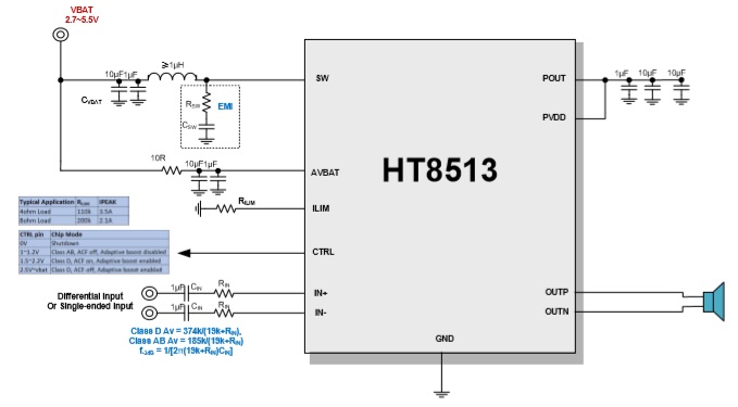 HT8513是一款內(nèi)置自適應(yīng)同步升壓的單聲道D類音頻功率放大器,由鋰電池供電時(shí), THD+N<1%、20-20kHz全頻段信號條件下,能 連續(xù)輸出3W功率(4Ω負(fù)載), THD+N=10%、 1kHz信號下,能連續(xù)輸出6.5W功率(2Ω負(fù)載); 另外,其還支持AB類模式。