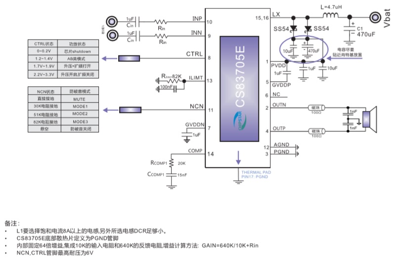 CS83705E的全差分架構(gòu)和極高的PSRR有效地提高對RF噪聲的抑制能力。無需濾波器的PWM調(diào)制結(jié)構(gòu)及內(nèi)置的BOOST升壓模塊,以及CS83705E采用專有的AERC((Adaptive Edge Rate Control)技術(shù),在音頻全帶寬范圍內(nèi)極大地降低了EMI的干擾,對60cm的音頻線,在FCC的標(biāo)準(zhǔn)下具有超過20dB的裕量,另外CS83705E內(nèi)置了過流保護(hù),短路保護(hù)和過熱保護(hù),有效的保護(hù)芯片在異常的工作條件下不被損壞。