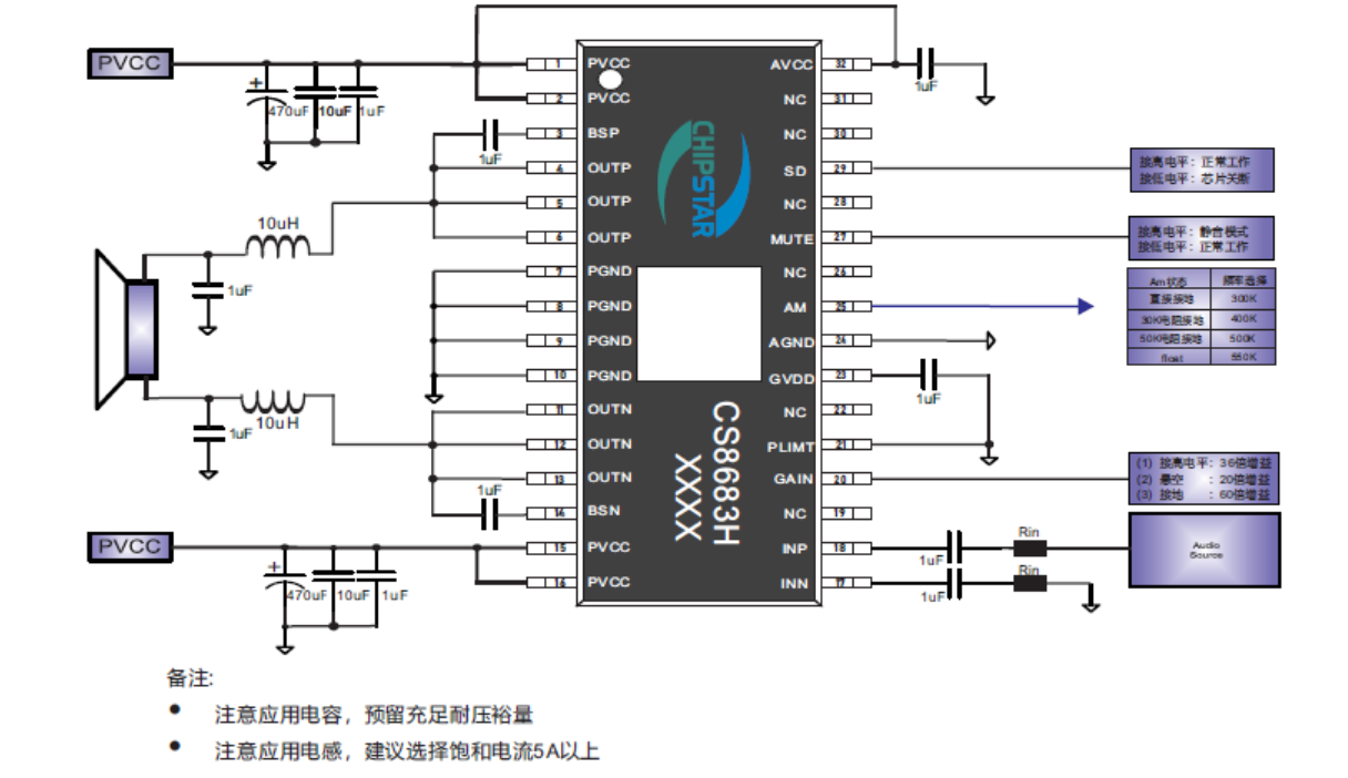 CS8685 2X75W/24V/4Ω或2X100W/28V/4Ω(峰值) EQB-32 5V-30V 低空載電流、AM抑制功能、帶主從模式、80W立體聲大功率D類音頻功放IC