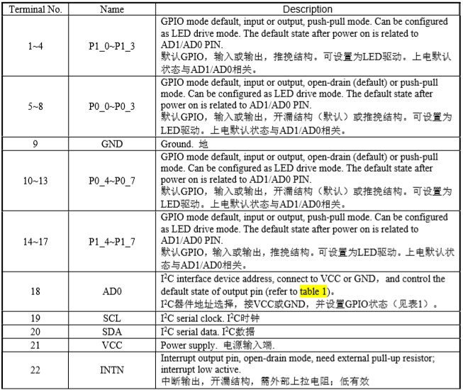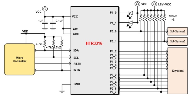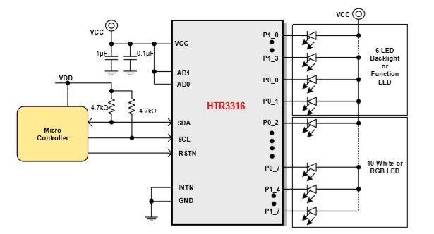 HTR33xx 是一款I(lǐng)2C 和 SMBus IO 擴(kuò) 展 器 , 2.2V~5.5V電源供電。16個(gè)IO端口中的任何一個(gè)都可以單獨(dú)配置為輸入或輸出。此外,任一IO可驅(qū)動(dòng)LED。 |